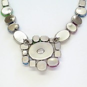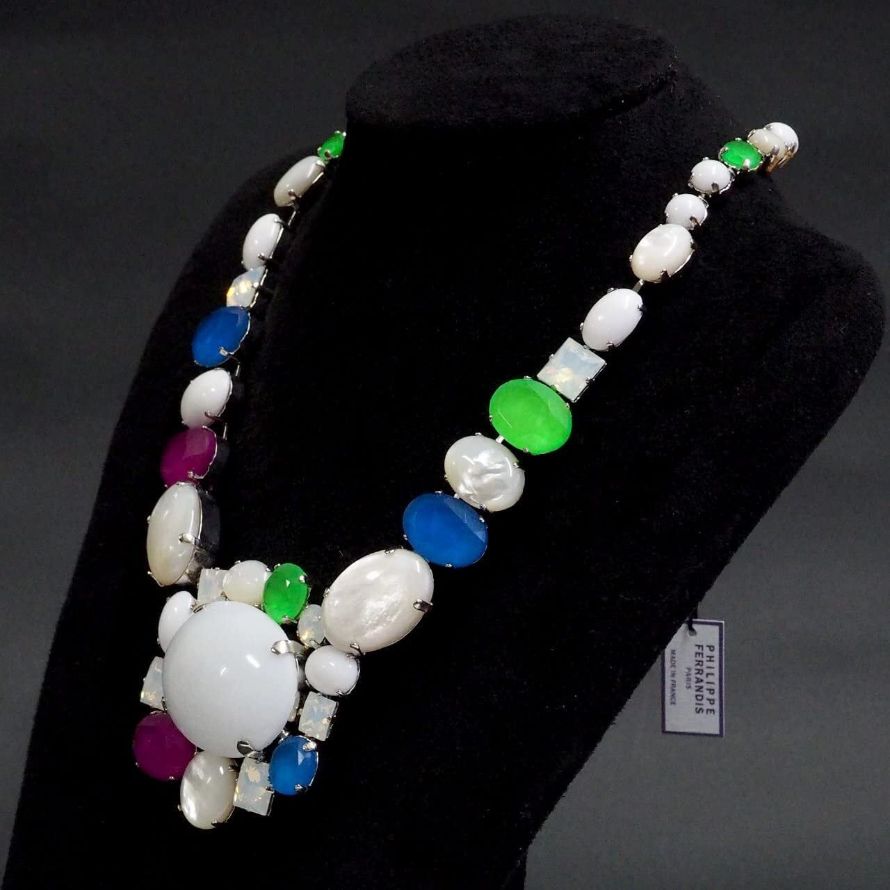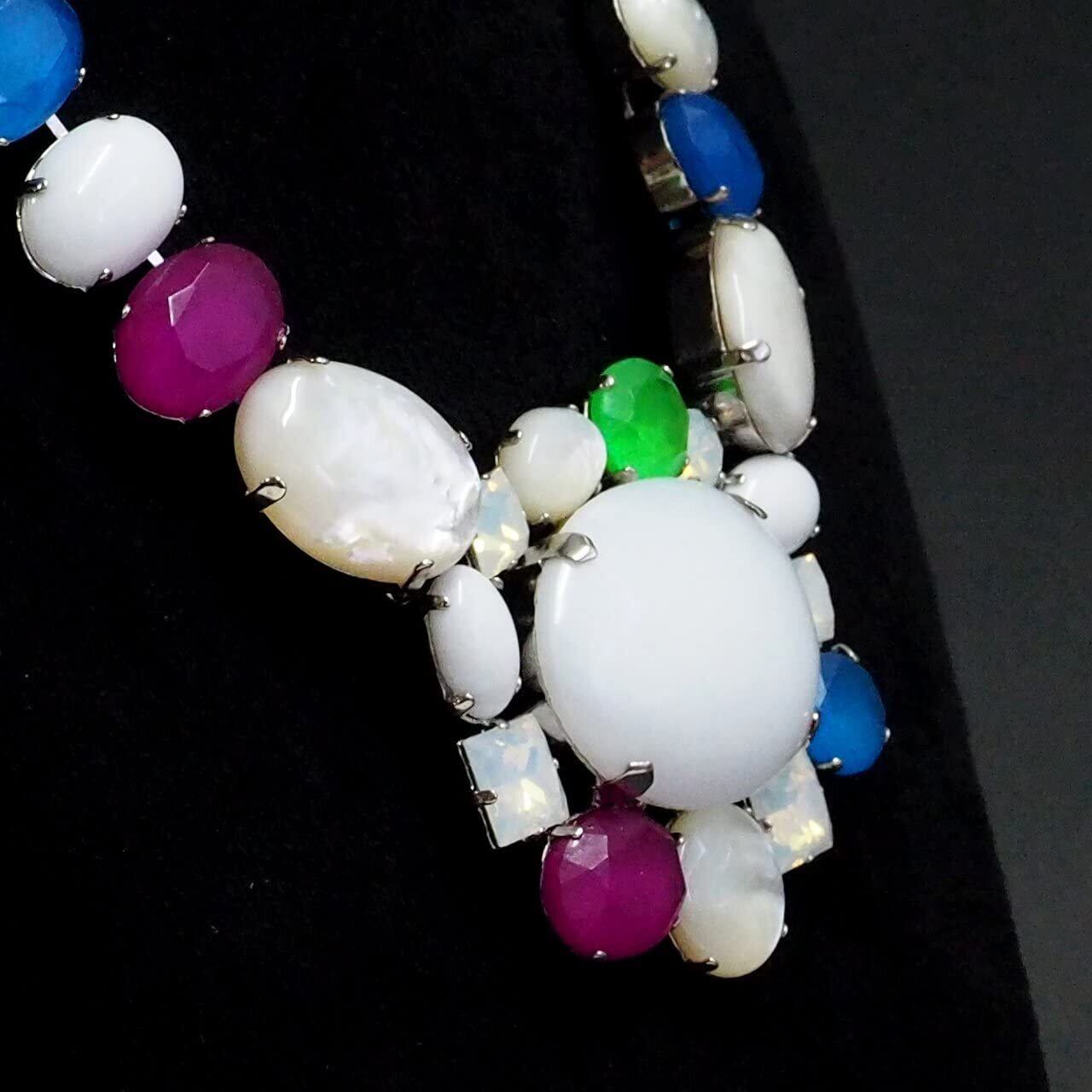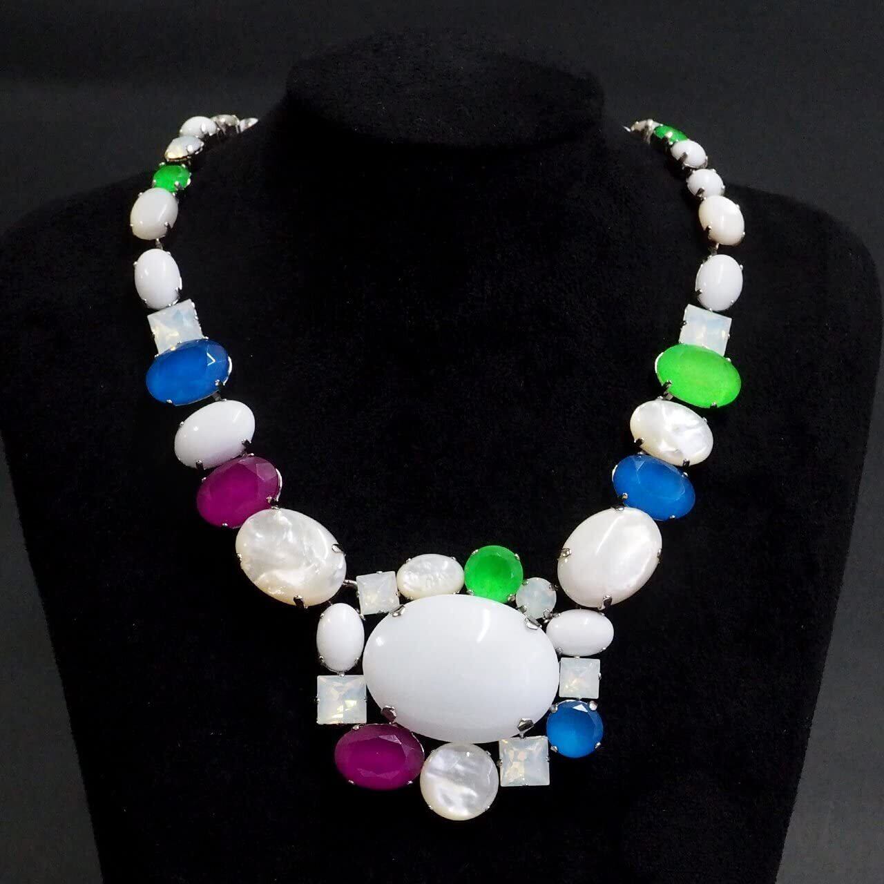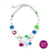 センターの白い大きな楕円形の周囲にカラフルな色を配した明るいネックレス。