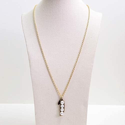 ブロンズカラーのリアルな長さ4センチのサヤに、光沢あふれる8ミリパールが4つ並んだかわいいエンドウ豆のネックレス。