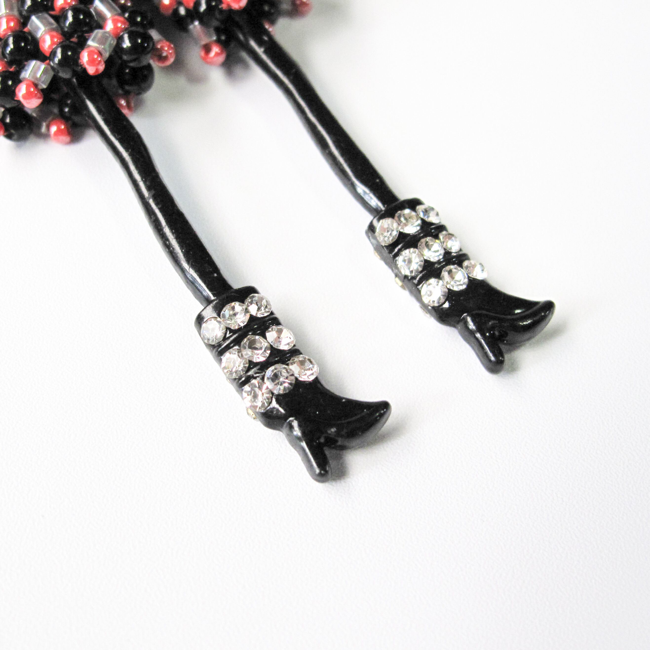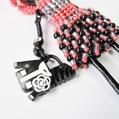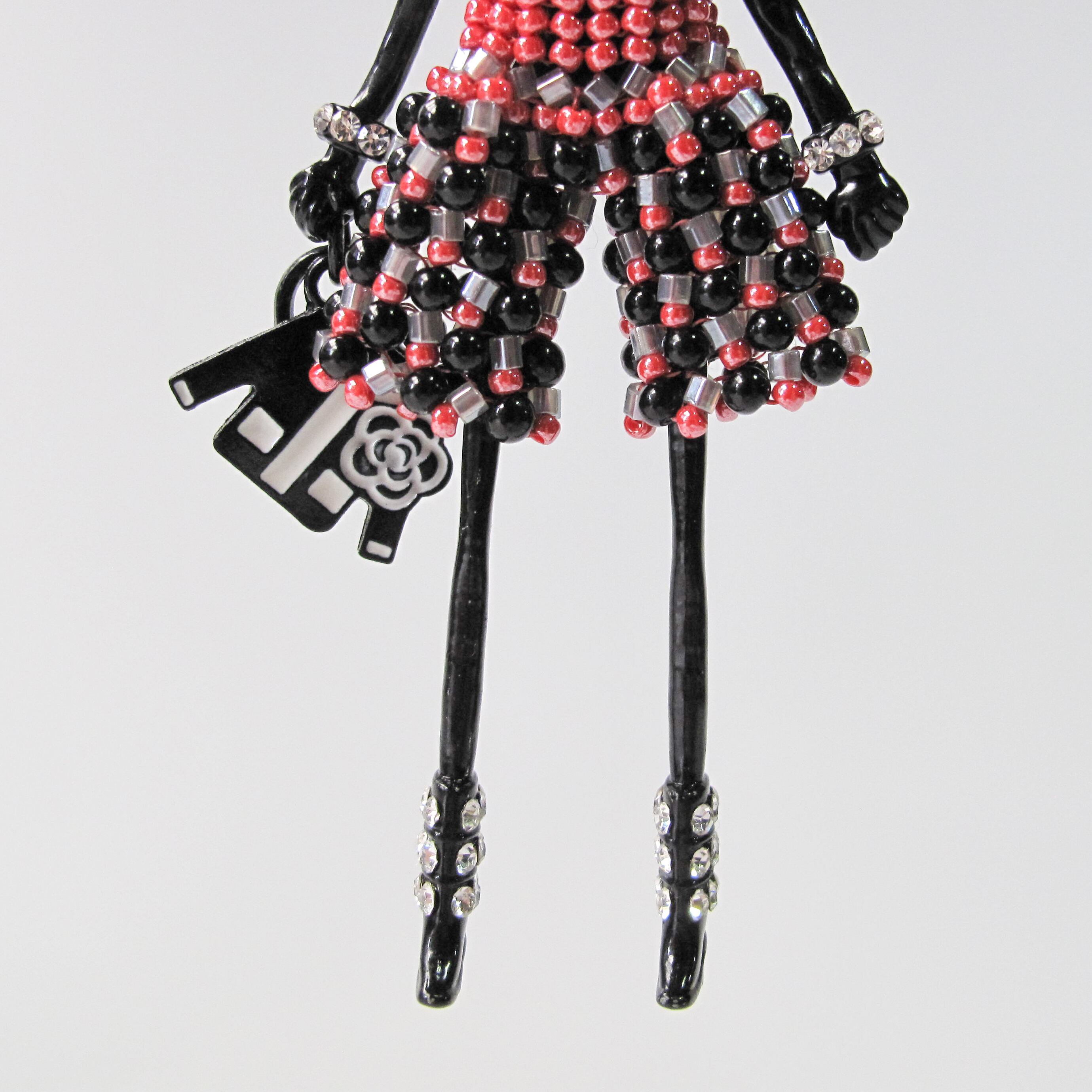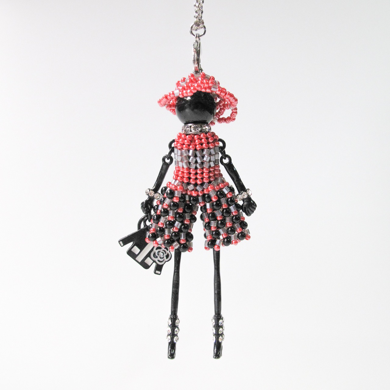 色、形の違うさまざまなビーズを何時間もかけて丁寧に編み、キュートなキュロットパンツを着た立体的なドールネックレスに仕上げました。