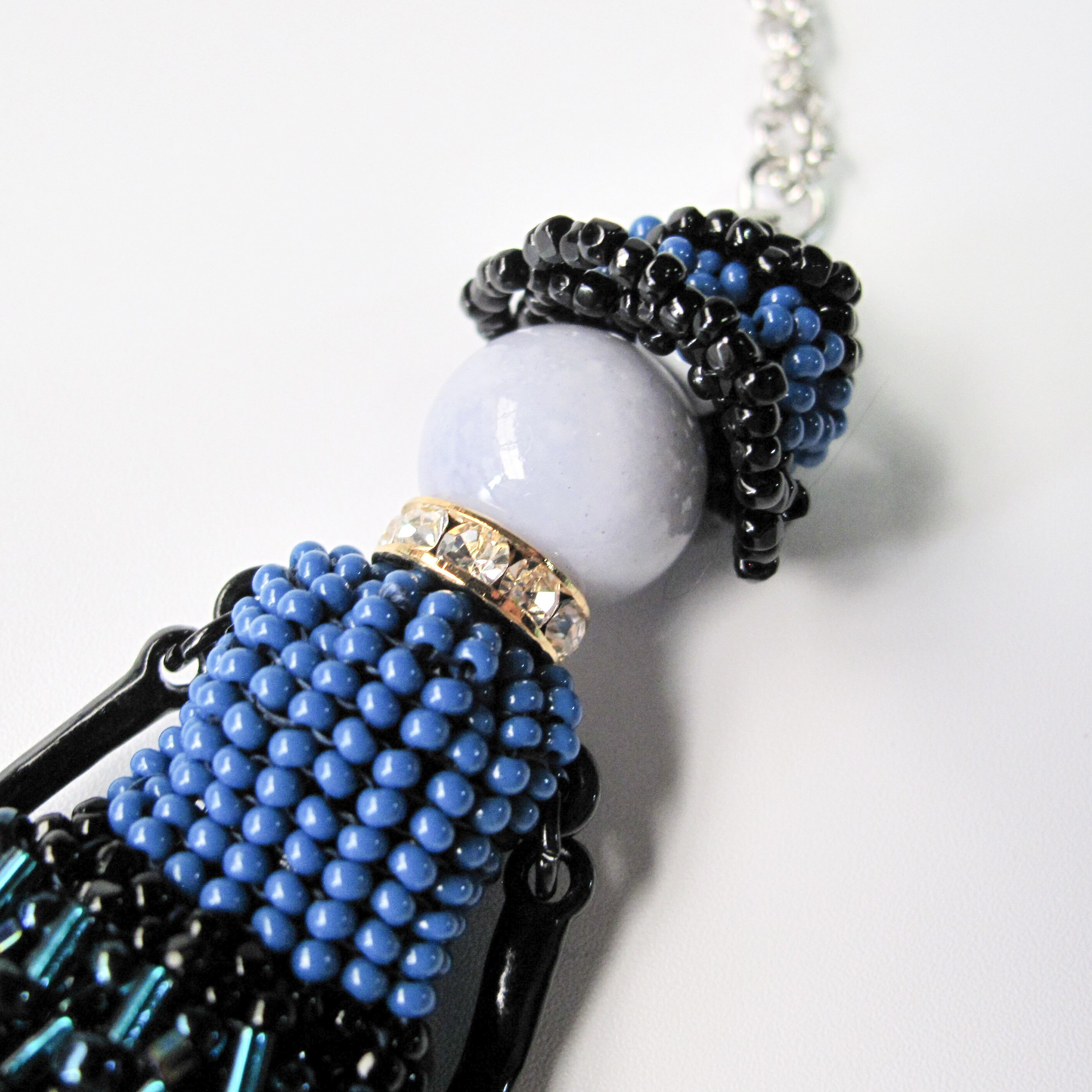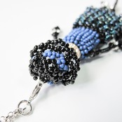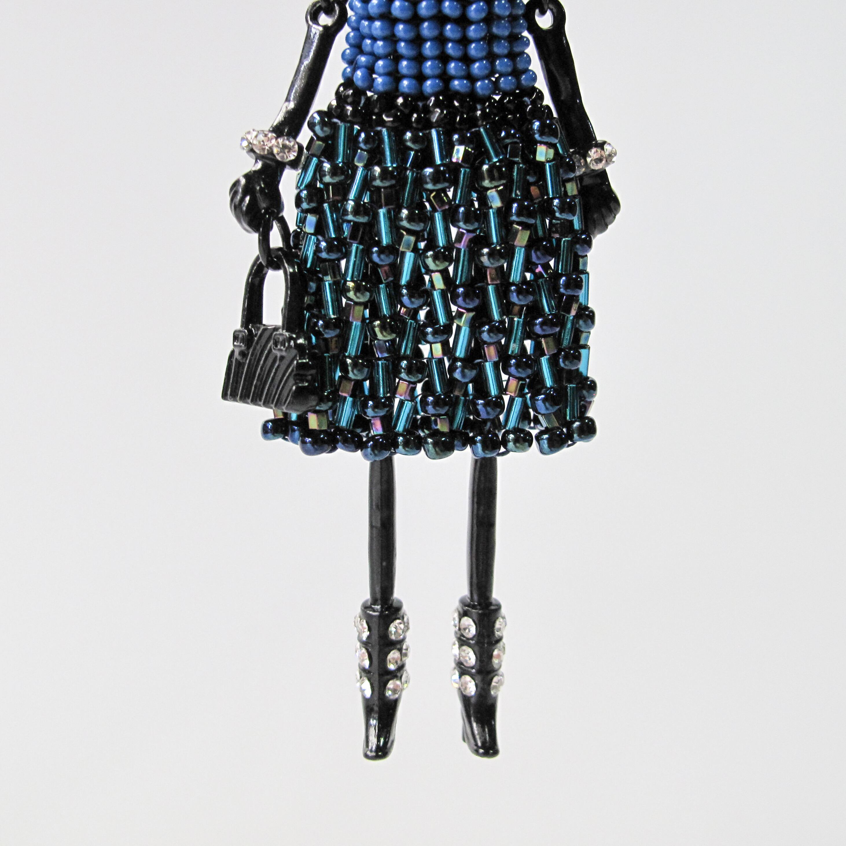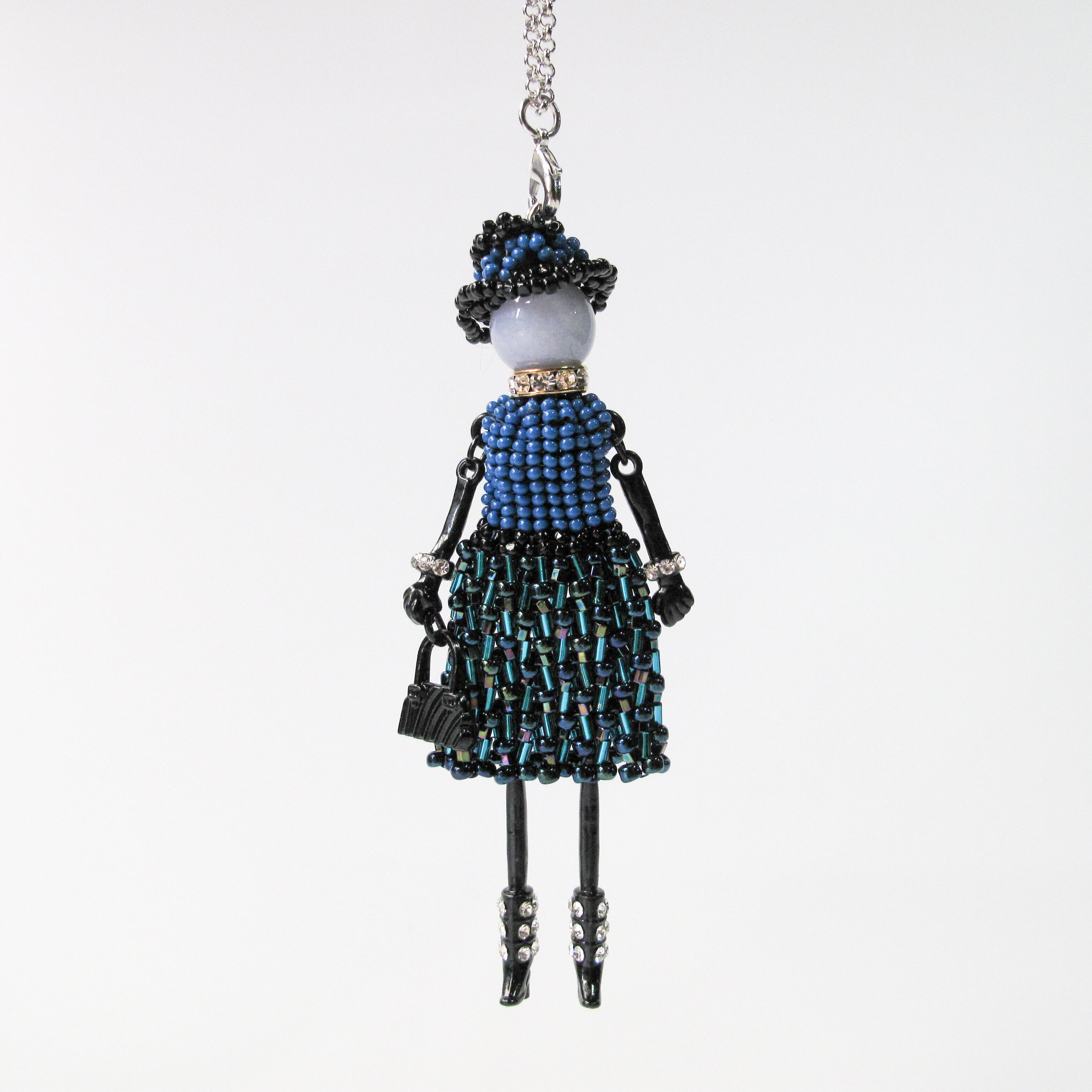 色、形の違うさまざまなビーズを何時間もかけて丁寧に編み、ゴージャスなドレスワンピースを着た立体的なドールネックレスに仕上げました。