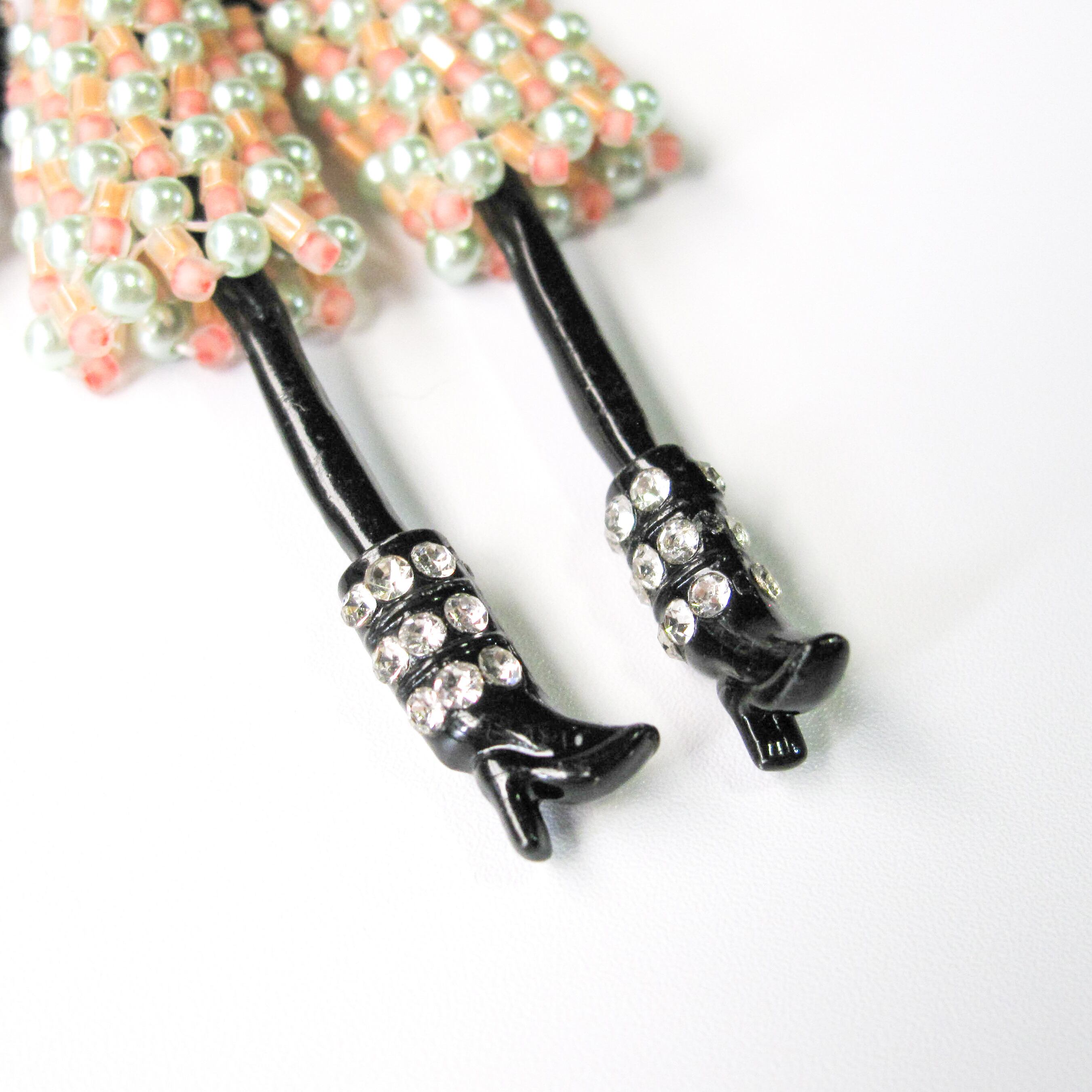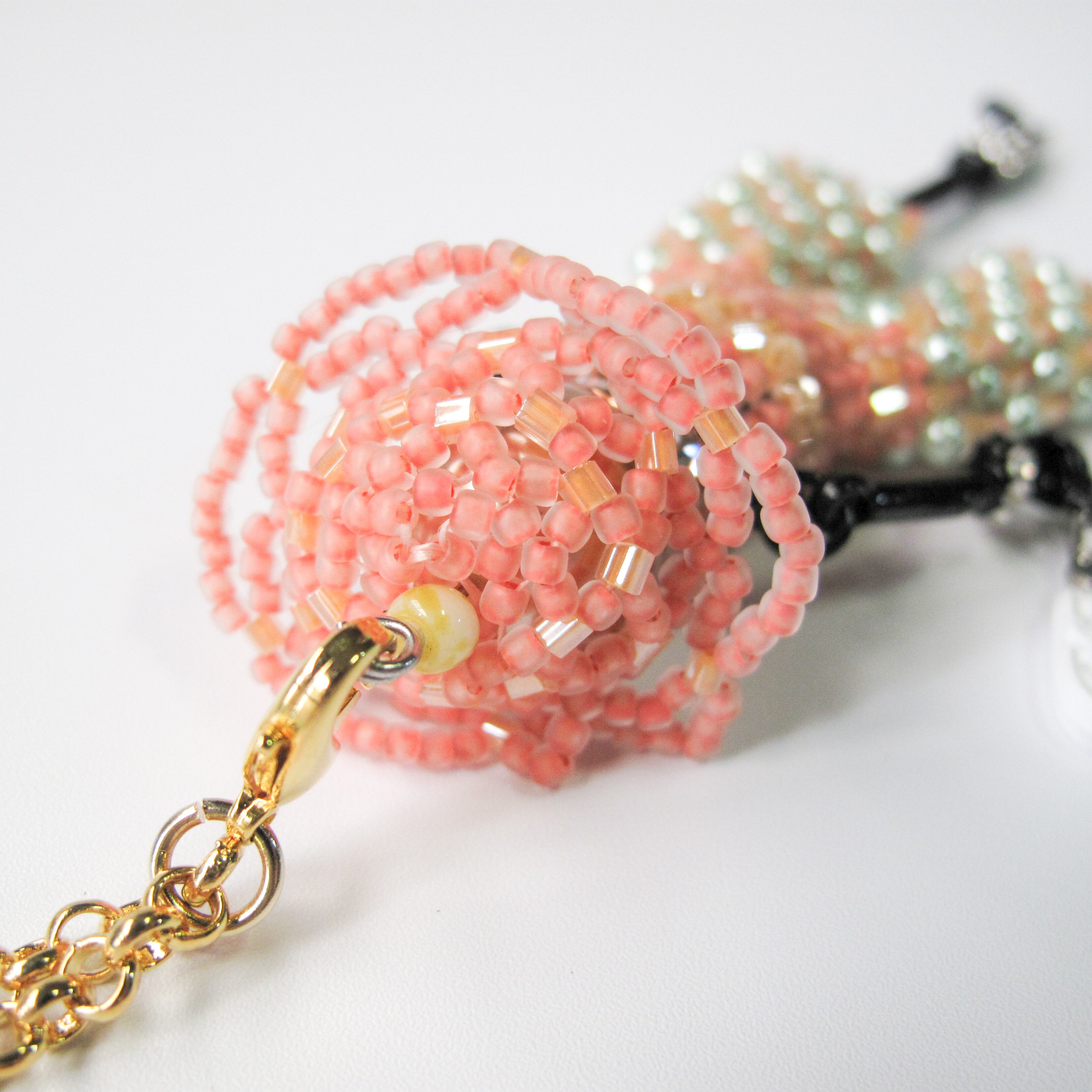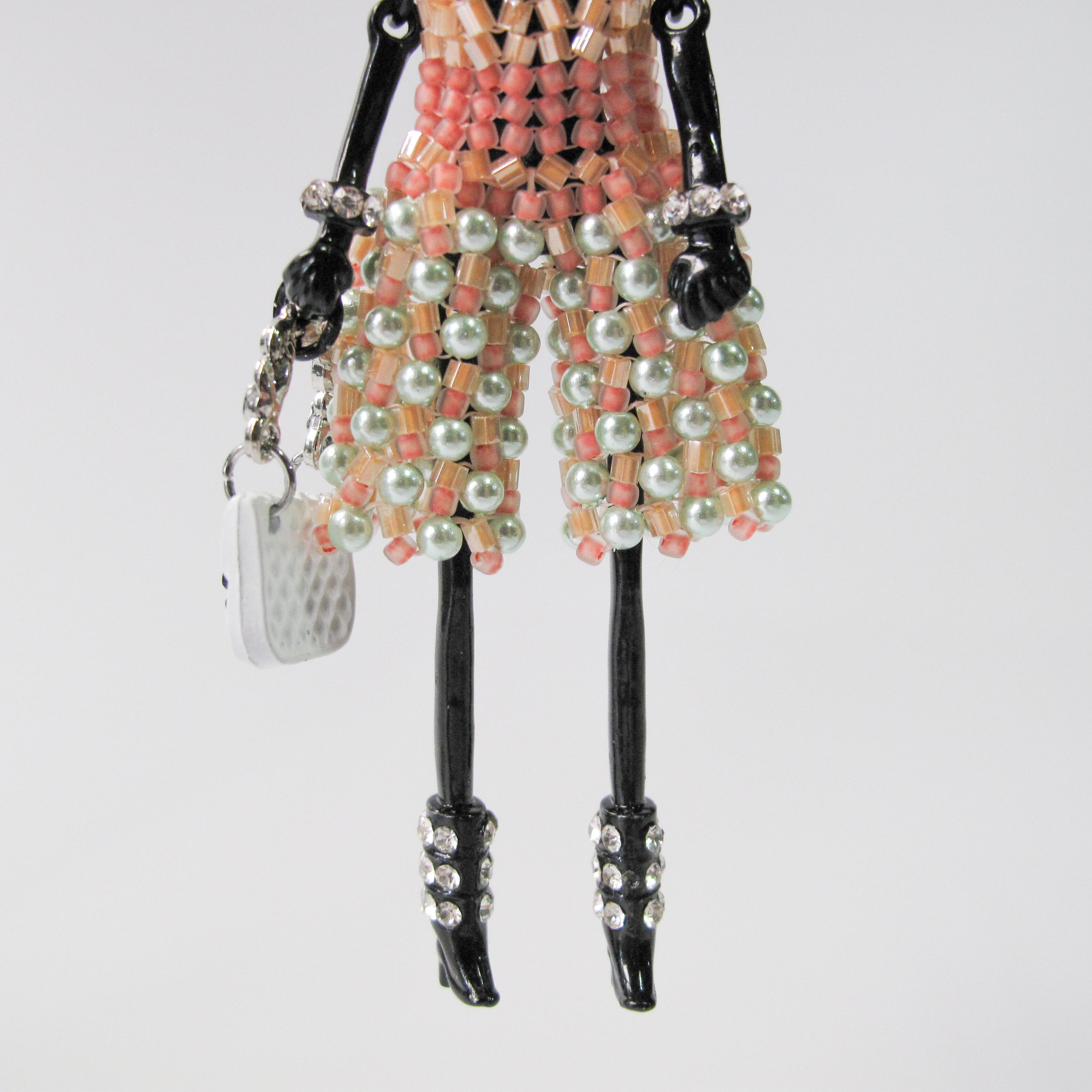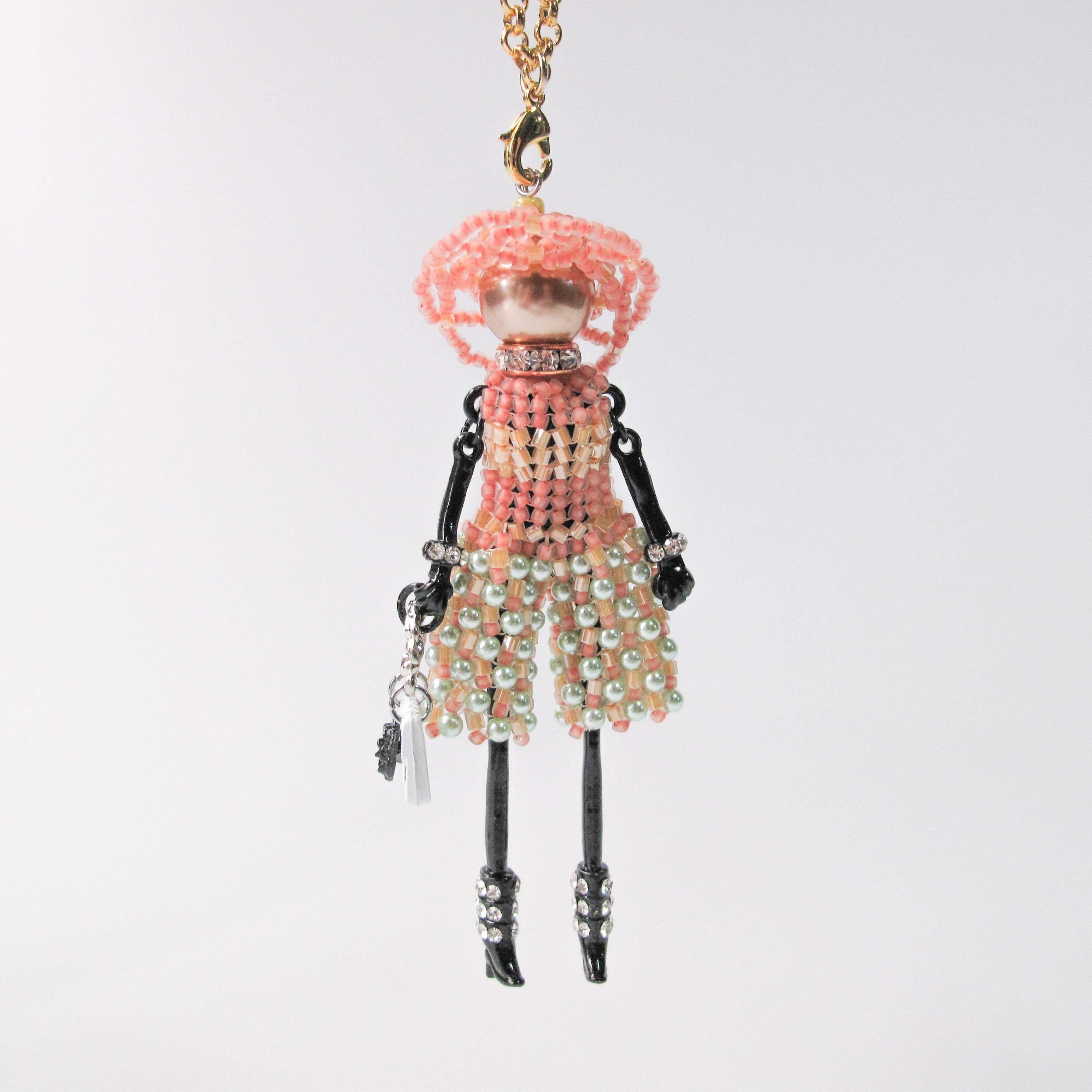色、形の違うさまざまなビーズを何時間もかけて丁寧に編み、キュートなキュロットパンツを着た立体的なドールネックレスに仕上げました。