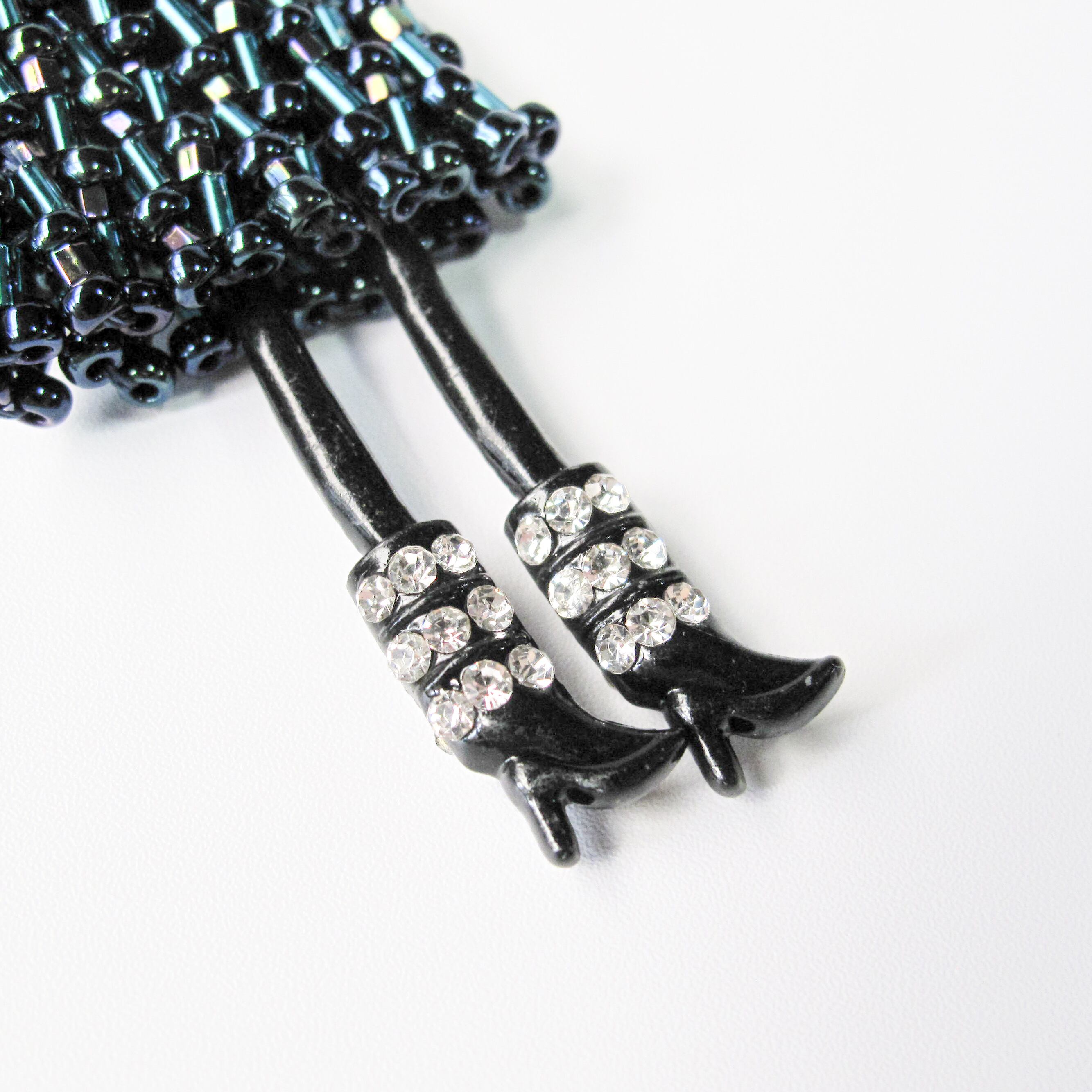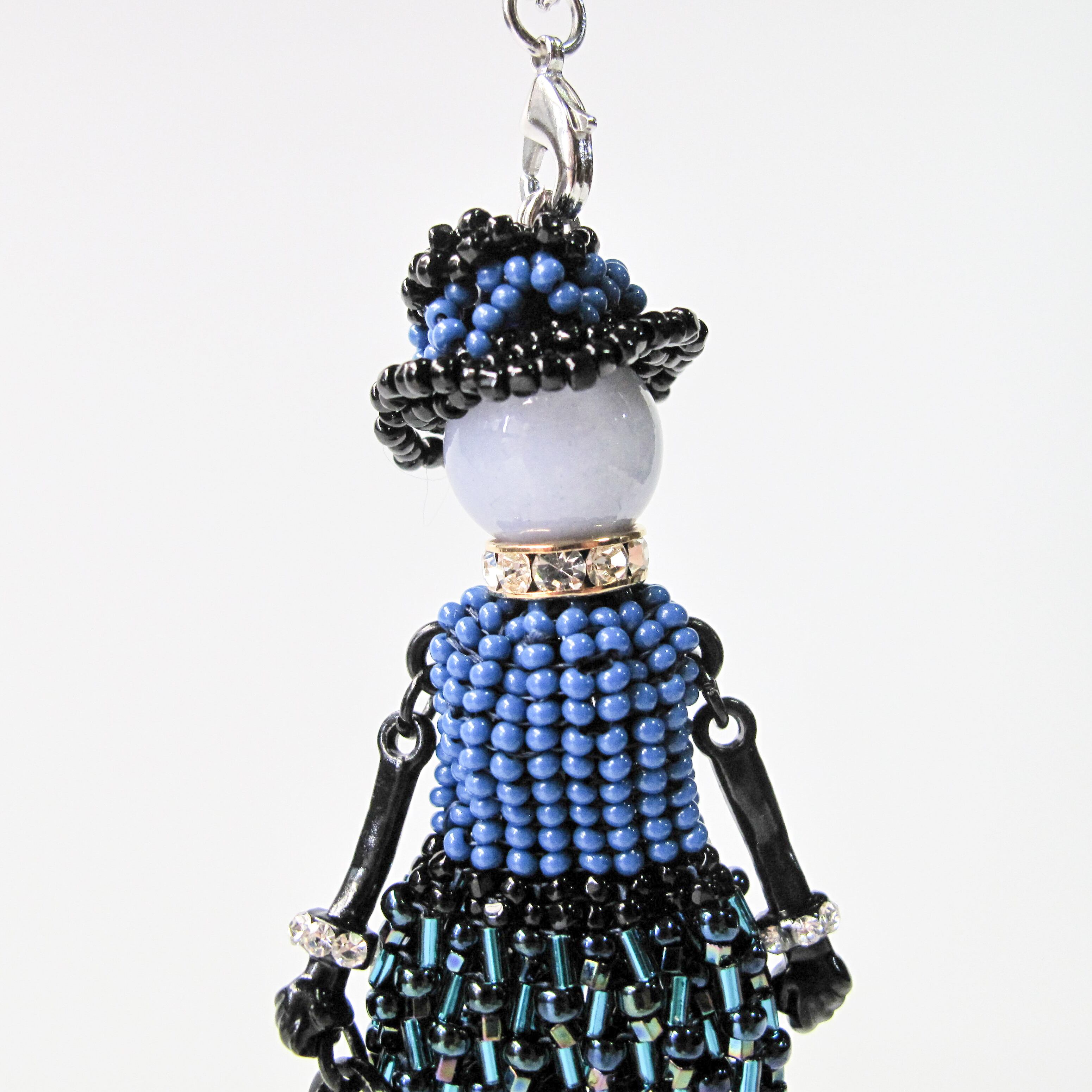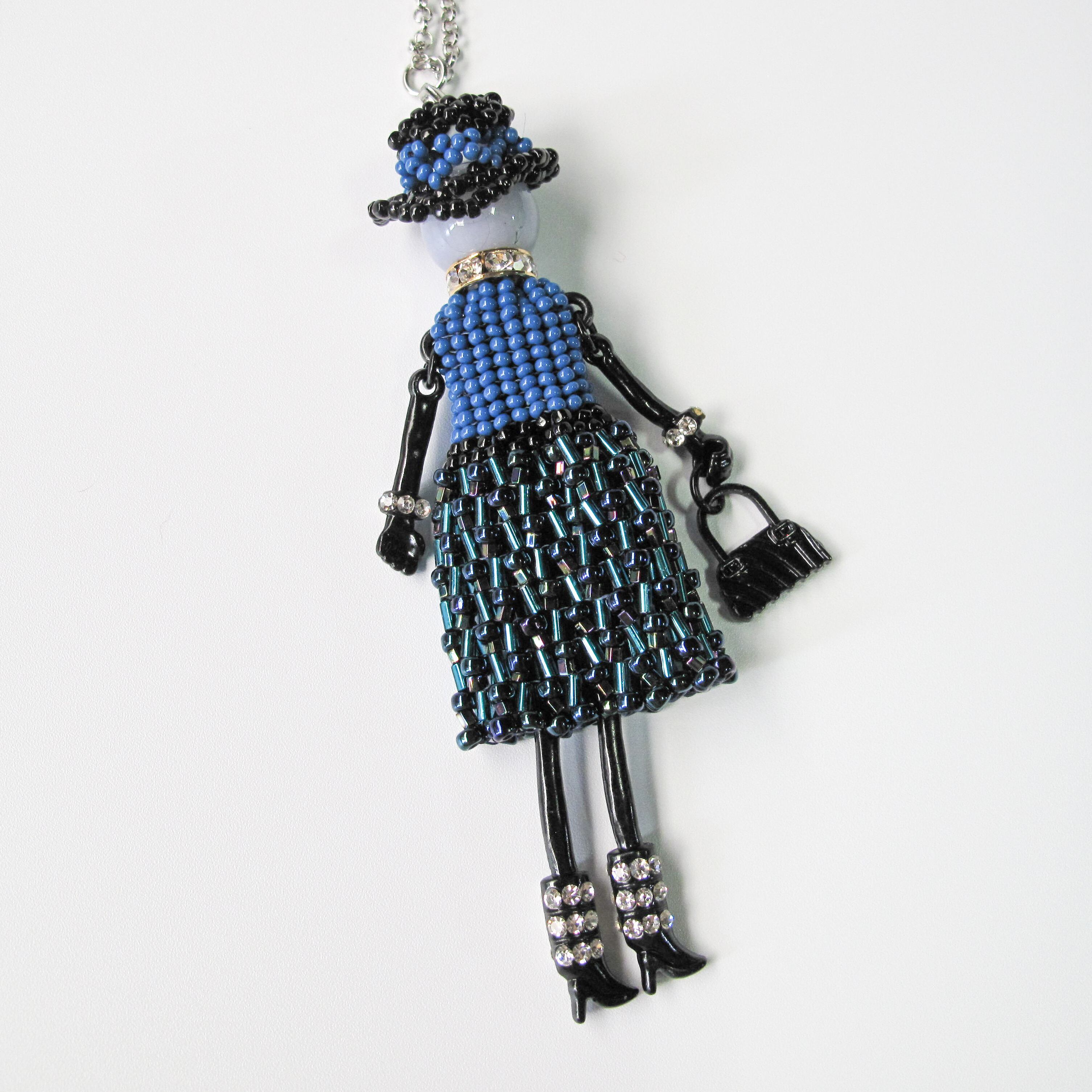 色、形の違うさまざまなビーズを何時間もかけて丁寧に編み、ゴージャスなケープワンピースを着た立体的なドールネックレスに仕上げました。